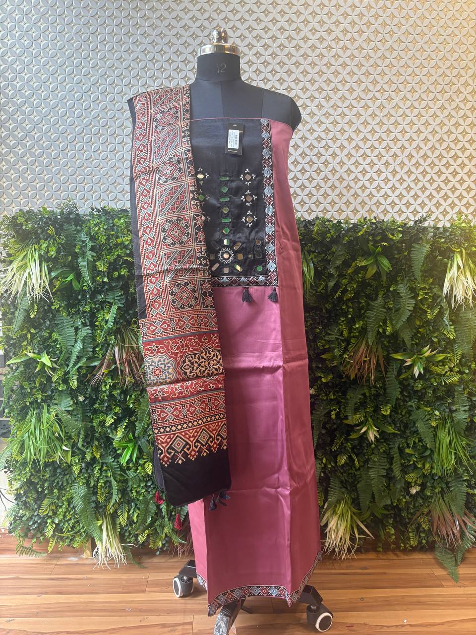 Paired with a handcrafted Ajrakh-inspired dupatta and a solid bottom, this set brings together the charm of age-old artistry with effortless modern grace. Ideal for mehendi functions, cultural events, or festive wear, it’s a drape of heritage stitched for the woman of today.