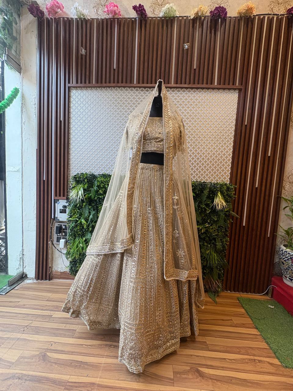 Step into the spotlight with this scintillating Champagne Gold lehenga set from Lable Rosaya. A true masterpiece of contemporary elegance, this ensemble is designed for the modern bride or the belle of the ball. The entire set, from the chic choli to the voluminous lehenga skirt, is lavishly adorned with an intricate geometric jaal of shimmering sequins, delicate mirror work, and fine pearl detailing. The soft net dupatta with its heavily embellished border completes this dazzling, heirloom-worthy look.