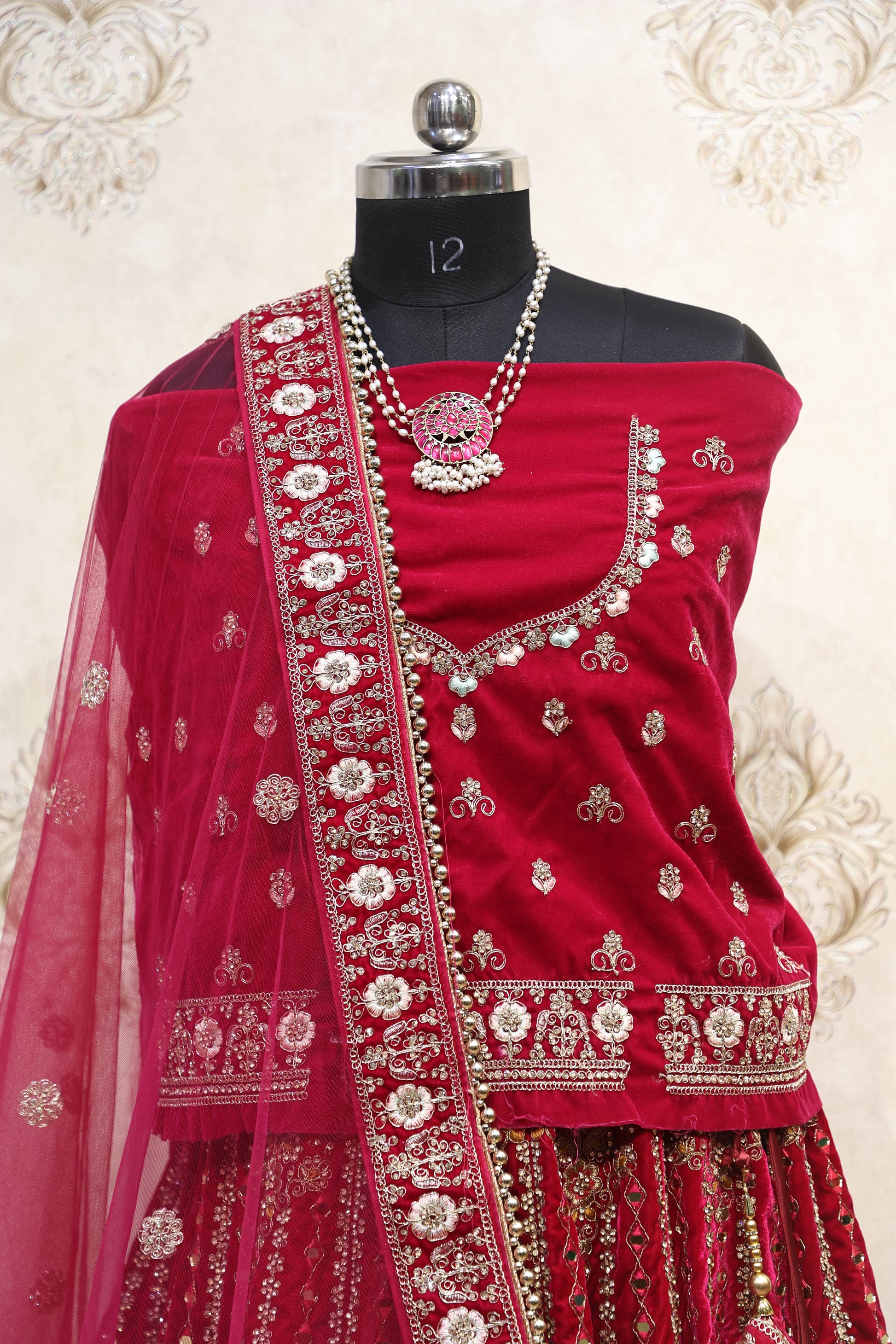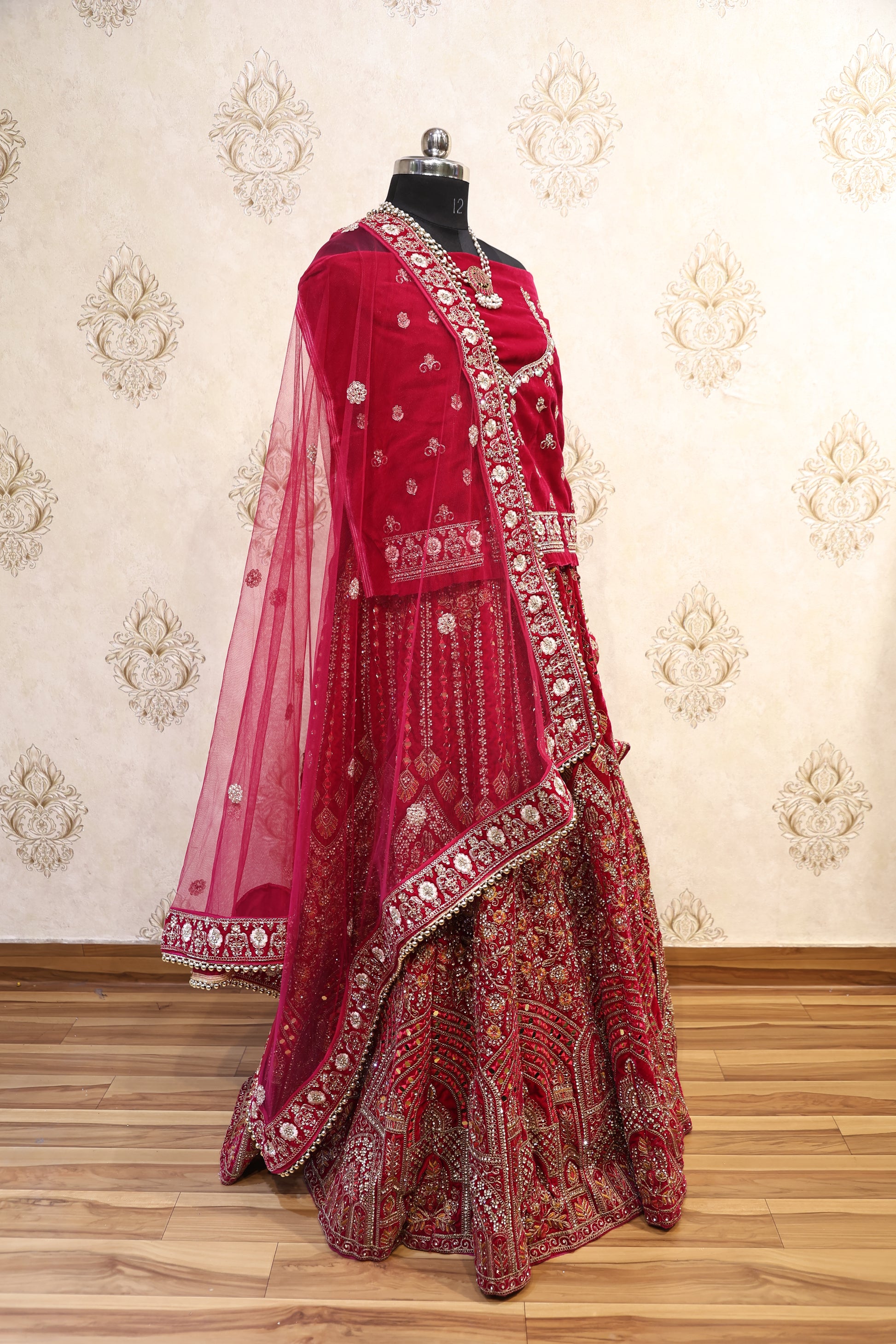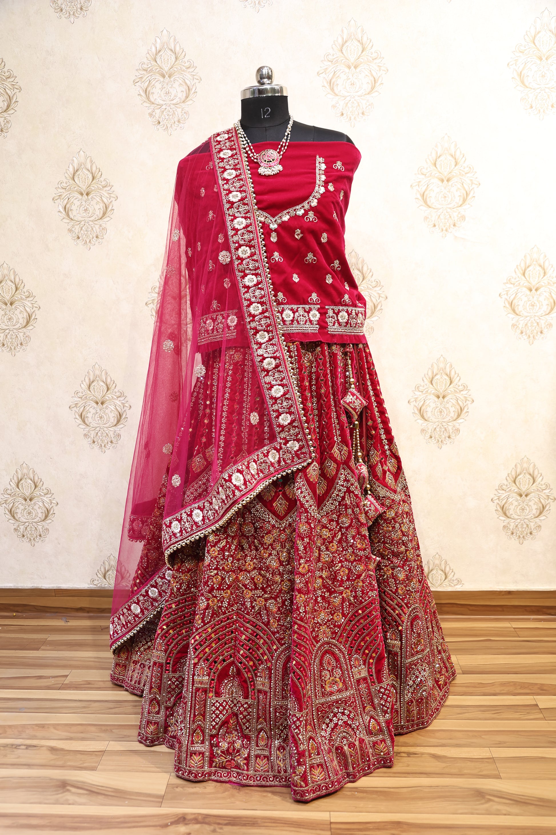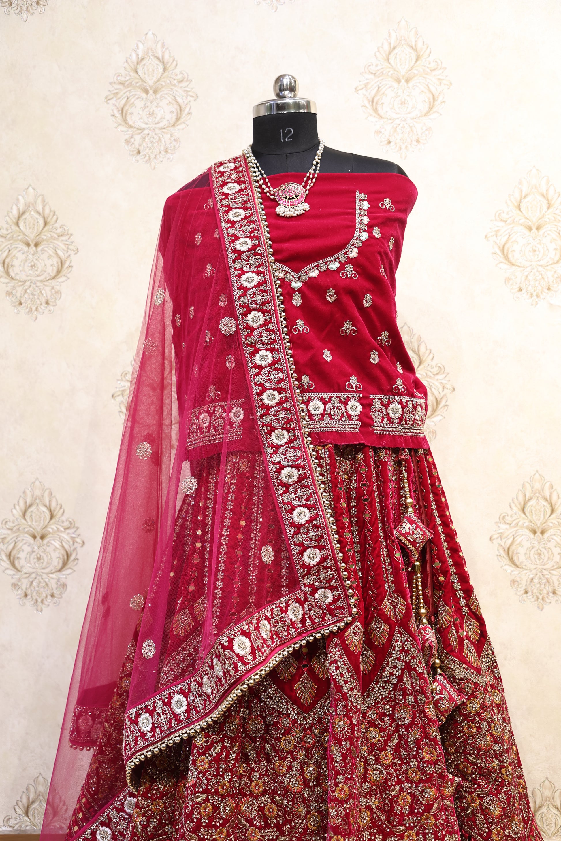 Step into timeless elegance with this Crimson Red Bridal Lehenga, a regal ensemble that radiates grace and grandeur. Crafted from plush velvet fabric, the lehenga is adorned with intricate zari, dori, and sequin embroidery work that adds rich texture and brilliance to the deep red base — a classic bridal favorite.