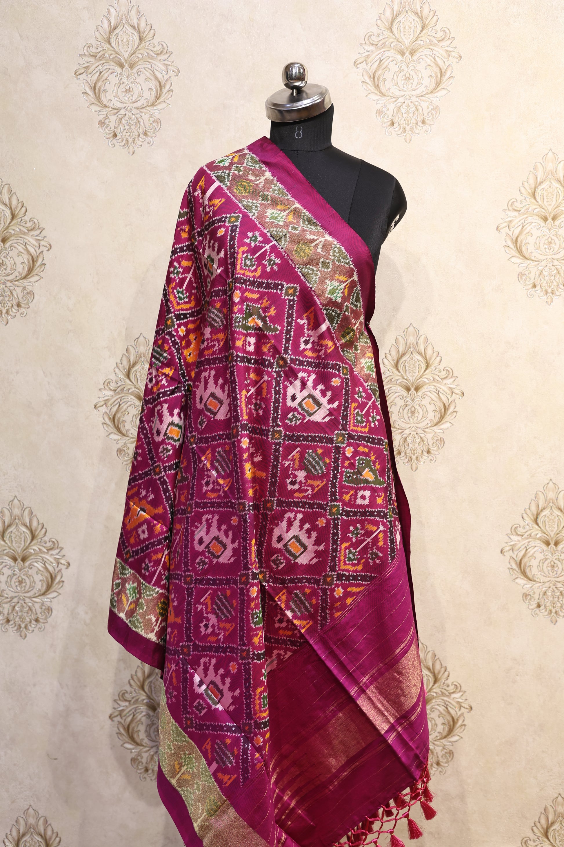 Step into the spotlight with this Fuchsia Fusion Ikkat Silk Dupatta, a vibrant celebration of traditional artistry and modern vibrance. Crafted in fine silk, this dupatta features multicolor geometric ikkat motifs set in a grid pattern, highlighted with a gleaming zari border and pallu.