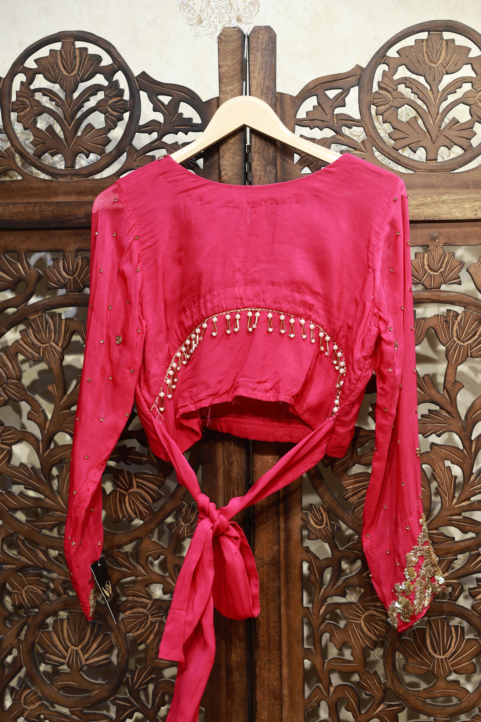 Wrapped in the timeless charm of heirloom pink, Gulbadan is a full-sleeved blouse that echoes royal nostalgia. Made from luxe silk georgette, it features hand-embroidered floral motifs on the neckline and sleeve cuffs. The defining element is the elegant tie-up detail at the waist, lending it a flattering drape and a modern silhouette. A perfect companion for lehengas, sarees, or Indo-western ensembles, it brings grace and grandeur with every thread.