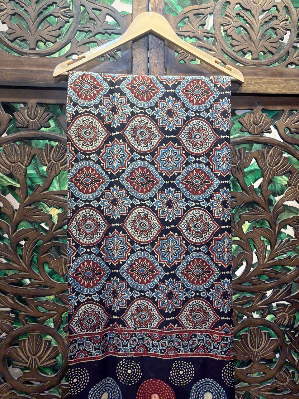 The soul of the saree lies in its authentic hand block prints. The deep indigo base is adorned with classic Ajrakh motifs in earthy shades of maroon, rustic red, and serene blue. The pallu features a stunningly intricate geometric and floral jaal pattern, while the body is decorated with elegant horizontal panels of concentric circles and delicate floral butis. Each motif is a testament to the meticulous skill of the artisans.