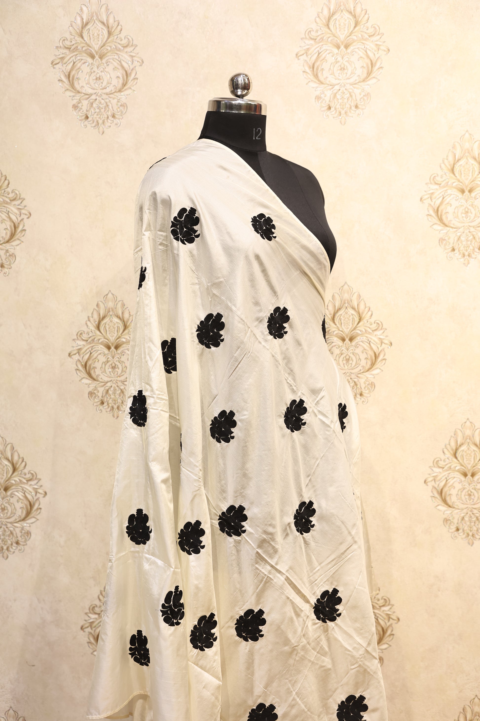 Minimal elegance meets handcrafted charm in this Ivory Black Floral Silk Work Dupatta. Crafted from smooth silk fabric, this dupatta features delicately hand-embroidered black floral motifs arranged in a clean, modern grid across a lustrous ivory base.