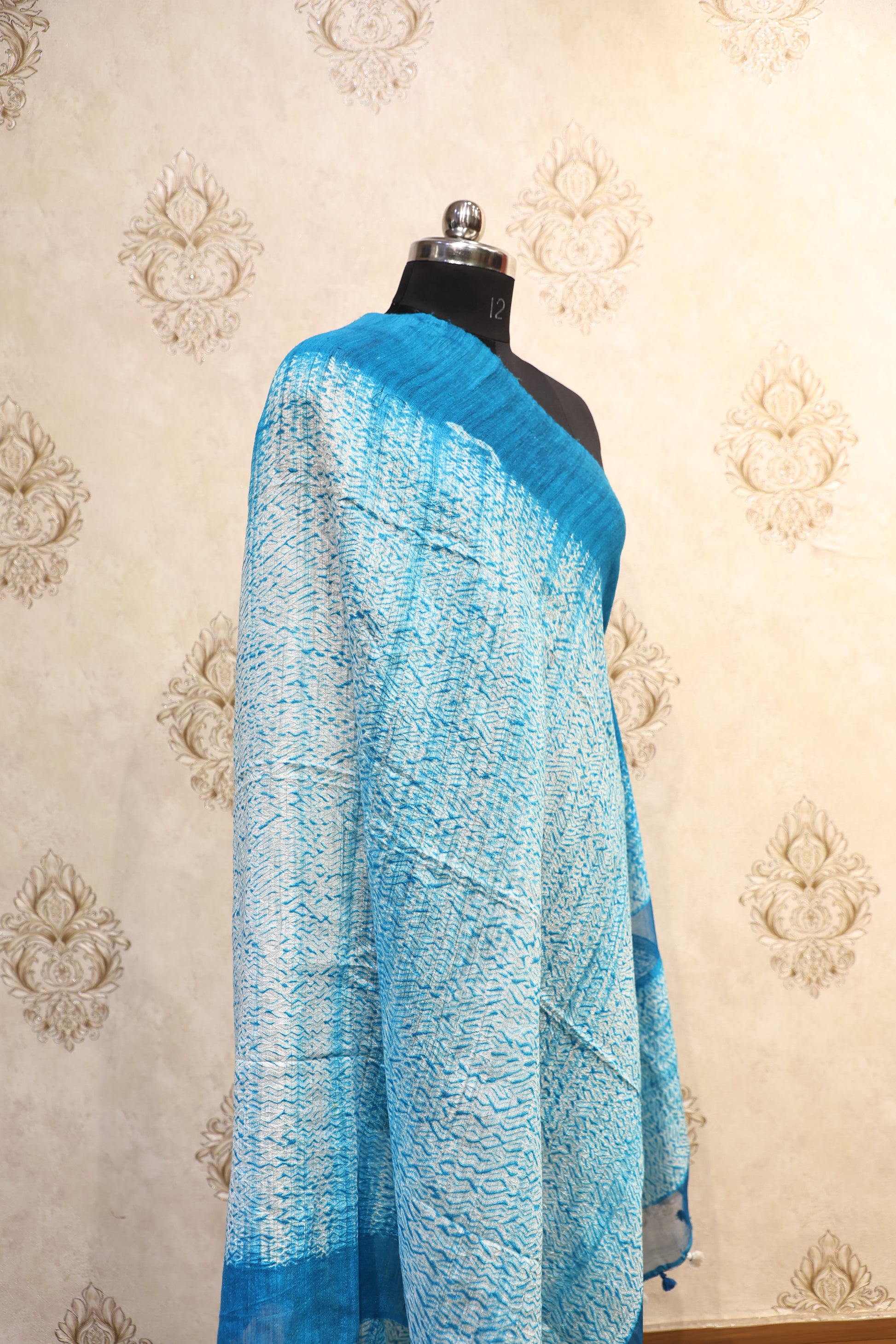 Bring a refreshing burst of color to your wardrobe with this vibrant Kalamkari Shibori-Inspired Dupatta. Crafted in soft cotton-silk, this dupatta merges the fluid art of traditional Kalamkari with the textured tie-dye effect of Shibori in a radiant ocean blue palette.