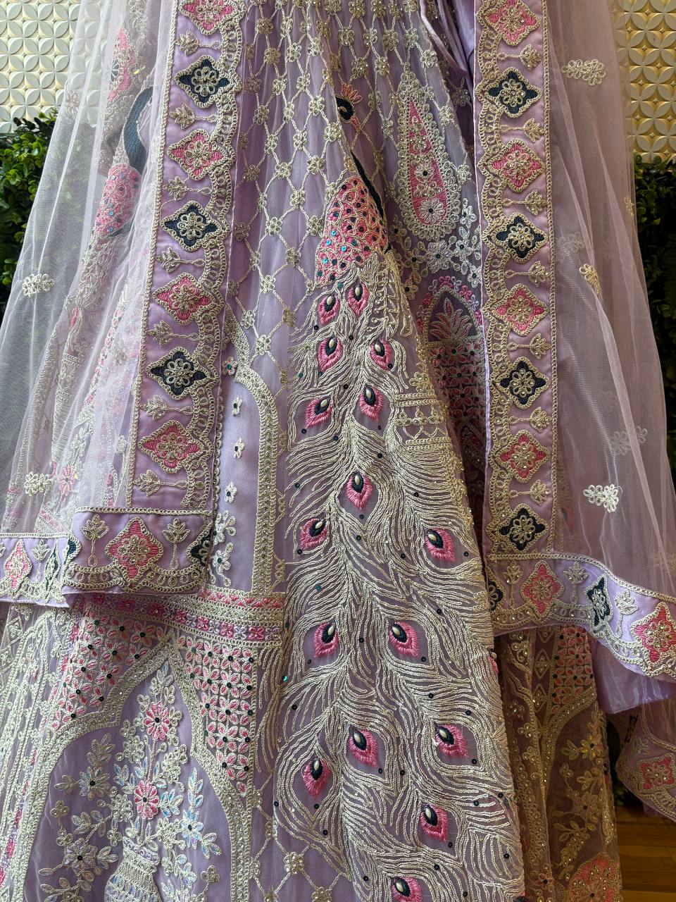 Step into a fairytale with this enchanting lavender lehenga set from Lable Rosaya. A masterpiece of whimsical elegance, this ensemble is designed to captivate. The voluminous georgette skirt is adorned with magnificent, intricately embroidered peacock motifs, brought to life with vibrant pink and black resham threads. The choli is a work of art in itself, featuring exquisite floral and geometric embroidery with delicate tassel details. The look is completed with a soft net dupatta framed by an ornate, matching border, making it a perfect choice for a sangeet, reception, or any grand celebration.