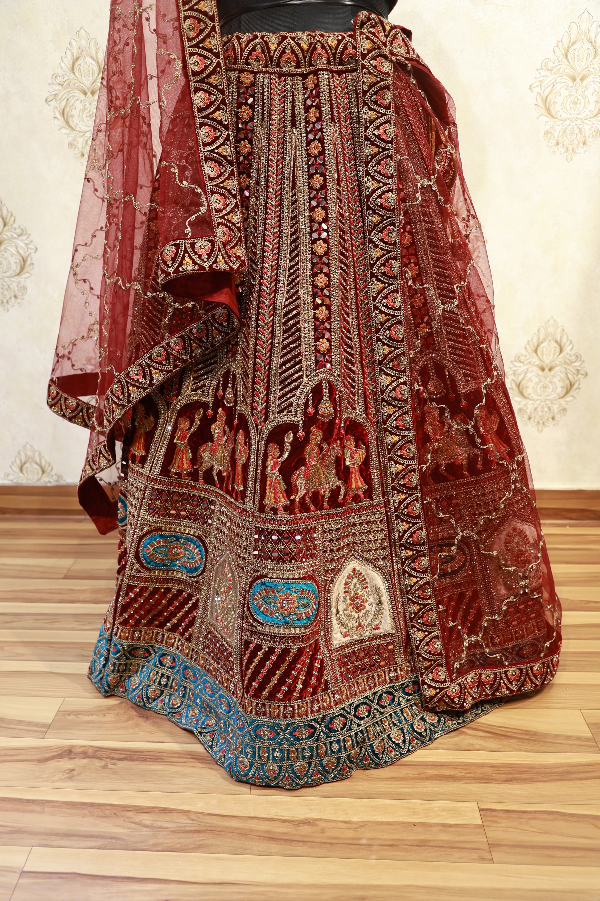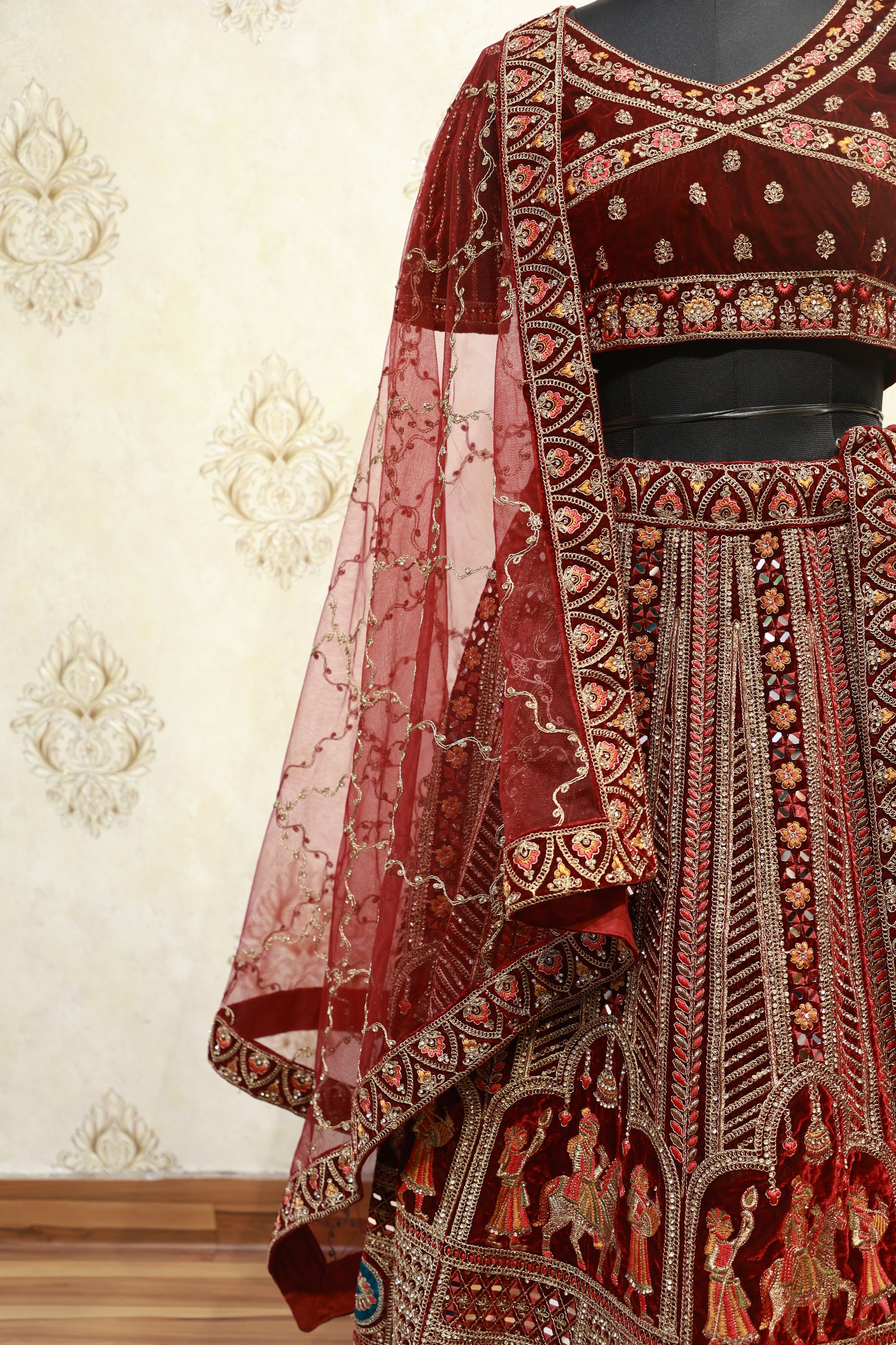 Fabric: Premium Velvet (Lehenga & Blouse), Soft Net (Dupatta)