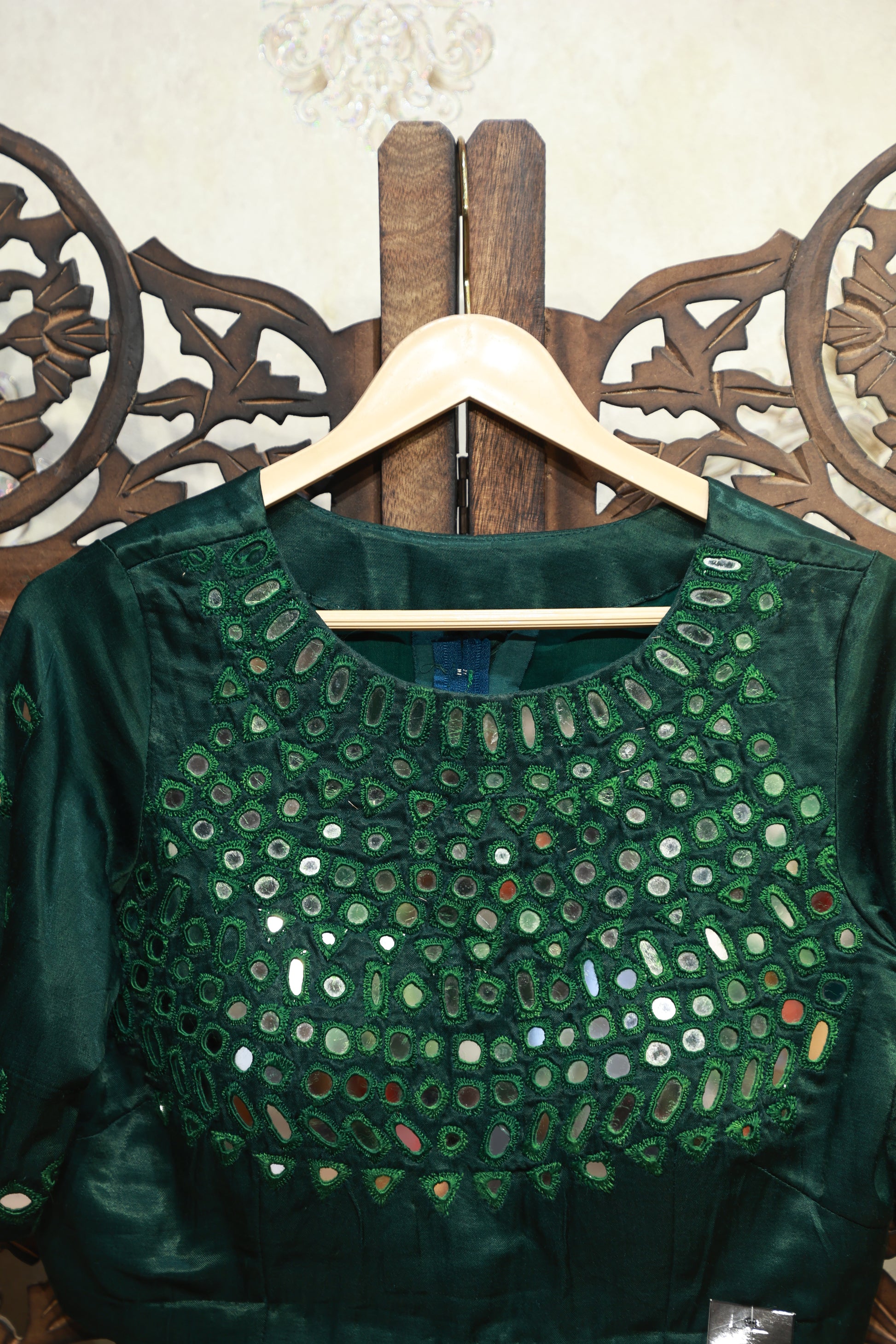 Add a radiant touch to your ethnic look with the Meher Emerald Mirror Work Blouse, a true blend of tradition and trend. Crafted from rich silk fabric in a deep emerald green, this blouse showcases intricate hand-embroidered mirror work arranged in artistic geometric patterns across the front and sleeves. The round neckline and half sleeves offer a graceful silhouette that complements sarees, lehengas, or festive skirts effortlessly.