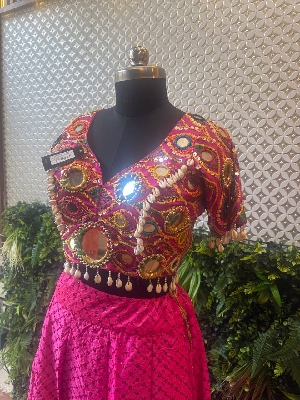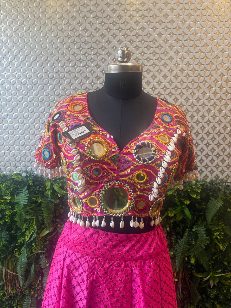 Celebrate the vibrant essence of traditional Indian craftsmanship with this mirror work Chaniya Choli Lehenga in stunning hot pink. The choli (blouse) is adorned with intricate Kutchi-style embroidery, vibrant thread work, real mirrors, and cowrie shells – all set against a multicolored canvas that radiates festive energy.