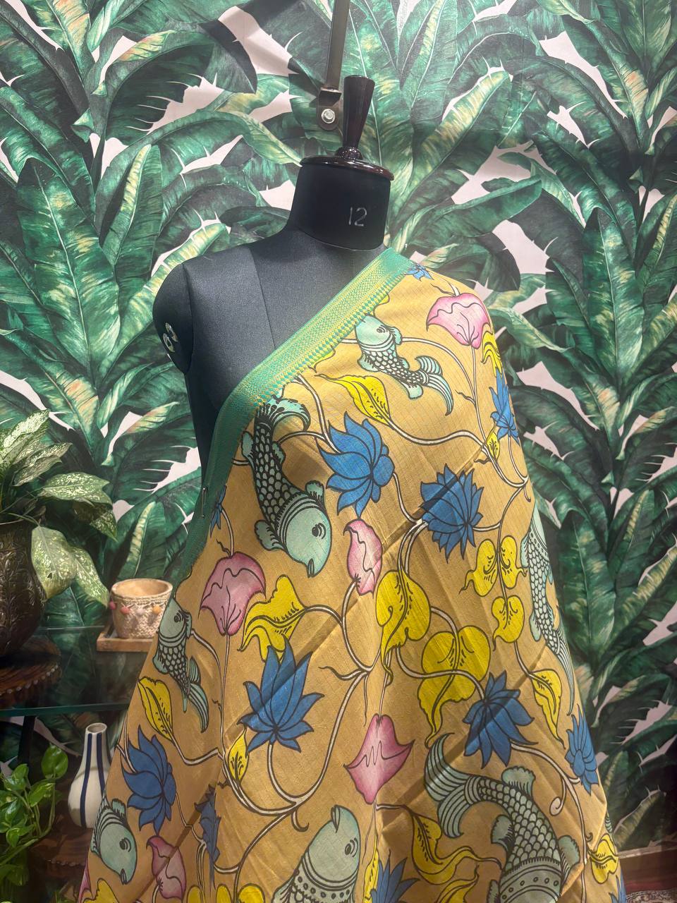 Wear a piece of joyful folk art with this stunning Bangalore Silk dupatta from Lable Rosaya. The warm, mustard yellow canvas comes alive with a whimsical Madhubani-style print, featuring auspicious 'Matsya' (fish) and lotus motifs in a vibrant palette of blues, pinks, and yellows. The entire masterpiece is framed by a rich, contrasting green woven border, adding a touch of elegance. This dupatta is a perfect celebration of color, art, and traditional Indian culture.