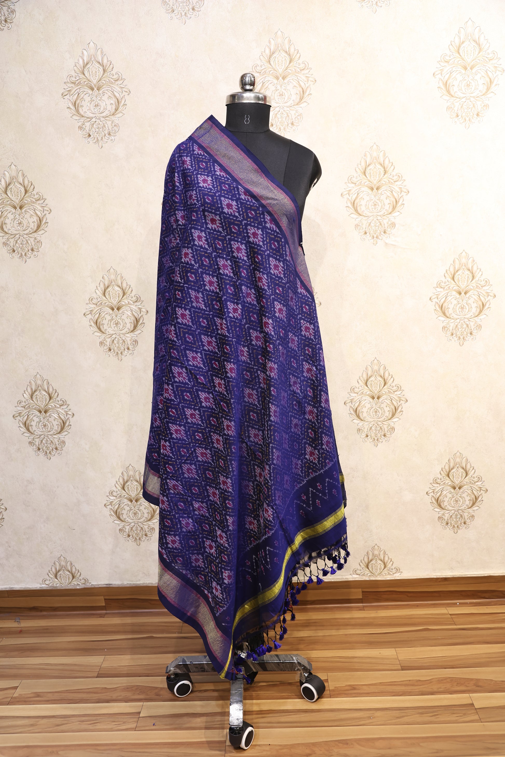The Neelaya Dupatta is a celebration of timeless ikkat patterns reimagined in rich hues and soft poly-silk texture. The deep royal blue base is accentuated with geometric ikkat motifs in lavender and magenta, enhanced by a contrast border in lime and black, ending in neat tassel fringes.