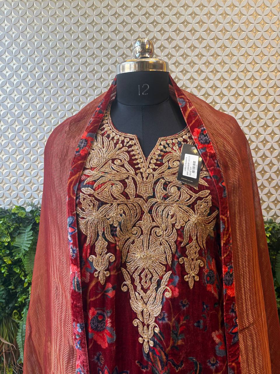 Regal Maroon Velvet Embroidered Suit – Royal Zari Work Ensemble