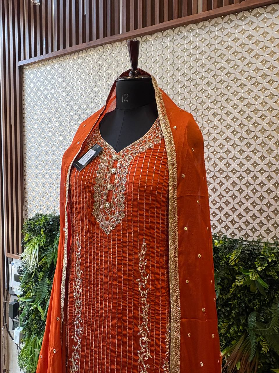 Embrace timeless elegance with this regal rust-orange suit set from Lable Rosaya. A true celebration of Indian heritage, this ensemble features a beautifully textured, long kurta lavishly adorned with intricate, Zardozi-style hand embroidery in antique gold. The detailed craftsmanship on the neckline, placket, and panels exudes opulence. It is perfectly paired with a voluminous skirt featuring delicate booti work and a lightweight dupatta with a matching border. This is the ultimate outfit for festive splendor, perfect for weddings, Karwa Chauth, or Diwali.