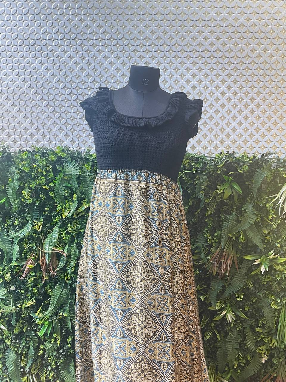 Elevate your wardrobe with this elegant Rosaya One-Piece Gown—a fusion of modern flair and timeless block print heritage. Featuring a stretchy smocked black bodice with delicate ruffle detailing and a beautifully flared ethnic print skirt, this gown is designed for comfort, style, and versatility.