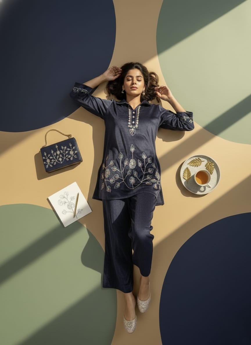 In the quiet glow of winter sunlight, this midnight-navy cord set unfolds like a verse written in soft threads. Rosaya brings to life a fabric that holds warmth close to the skin, woven with the gentleness of tradition and the elegance of old-world charm.