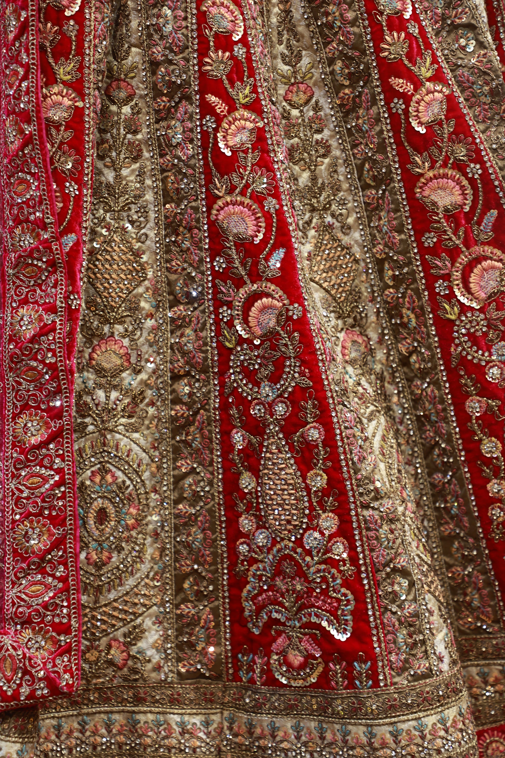 Step into a world of timeless elegance with the Royal Crimson Heritage Bridal Lehenga, a luxurious ensemble that celebrates regal charm and meticulous craftsmanship. The deep crimson red velvet lehenga features opulent vertical panels richly embroidered with golden zari, antique sequins, resham work, and mirror embellishments — perfect for a grand bridal entrance.