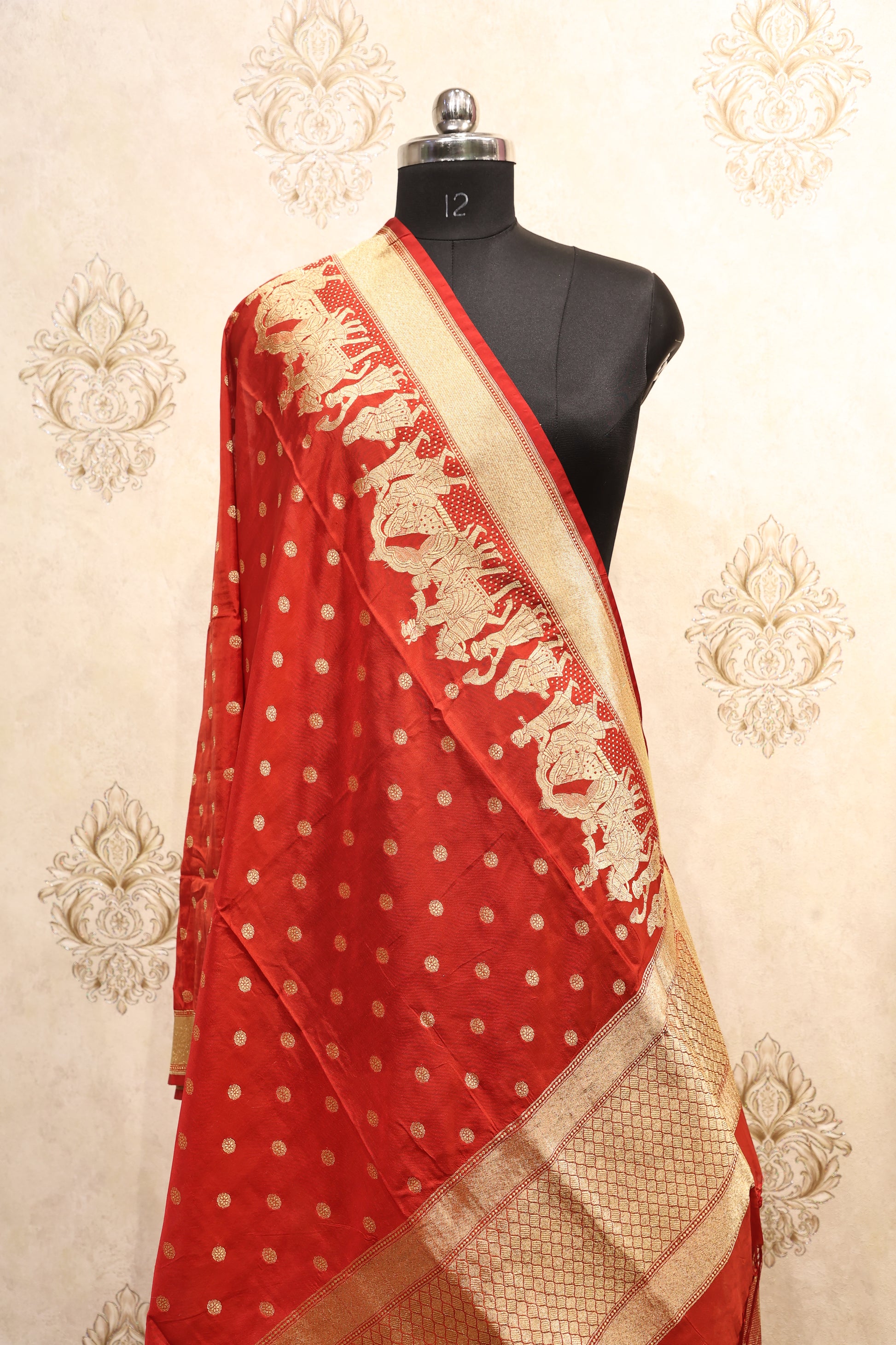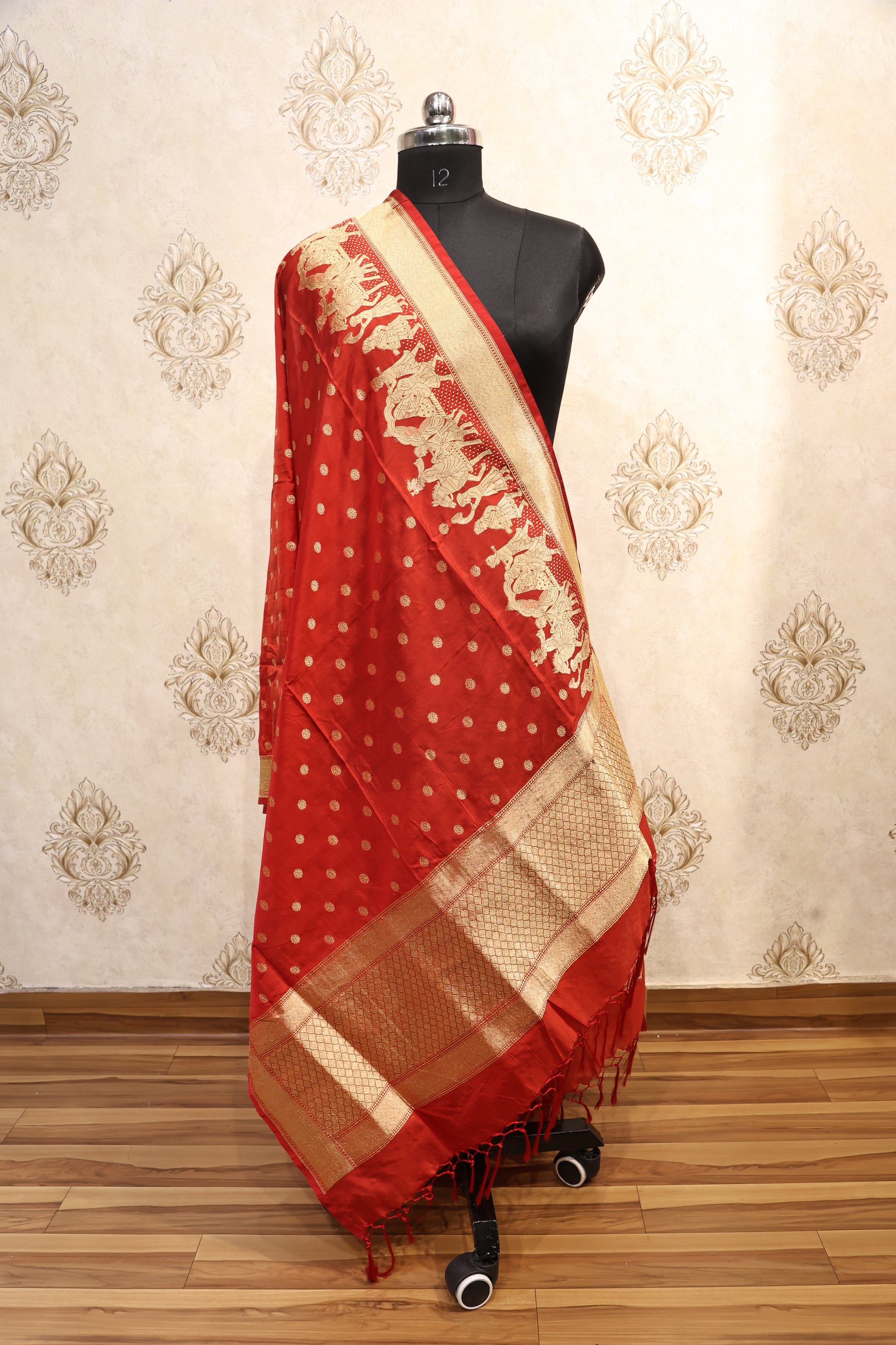 The Rukhsar Dupatta is a stunning traditional piece crafted in rich red Banarasi silk, woven with intricate golden zari motifs. Highlighted with delicate butis all over and a regal border, the dupatta’s pallu features an elaborate peacock and floral zari design, reflecting timeless elegance.